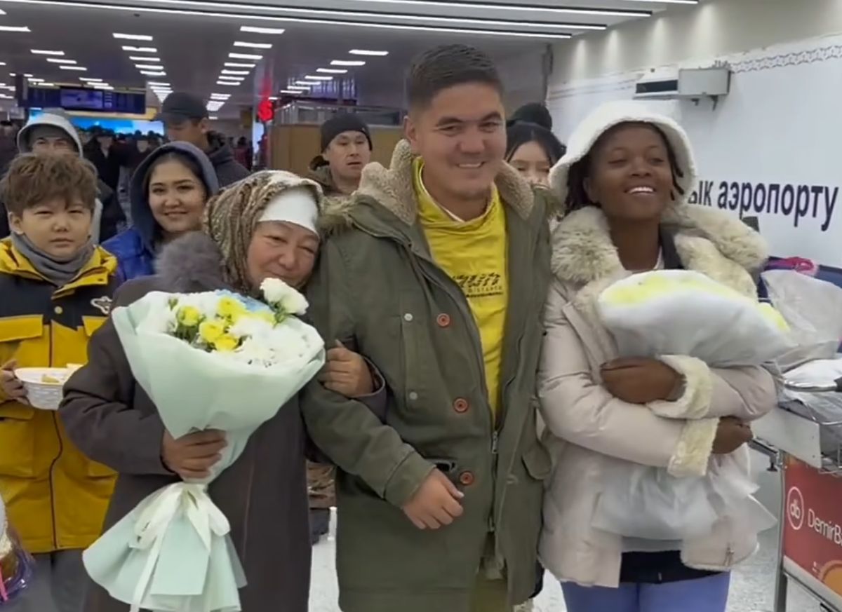Жас жұбайларды әуежайдан туған-туыстары жылы қарсы алып, келінін ұлттық дәстүрге сай ақ жаулық жауып қарсы алғаны туралы бейнежазба желіде жария болды.
